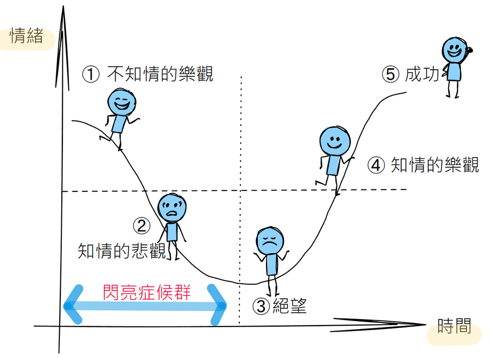 我在谷底的地方畫了一條鉛直線,鉛直線左邊的一~三階段就是閃亮症候群的循環,你放學後買了新的參考書,跟著同學報名了新的補習班,回頭開始了第一階段-不知情的樂觀,然後不斷循環,回到剛剛說的,別人家的草總是比較綠,是真的嗎?